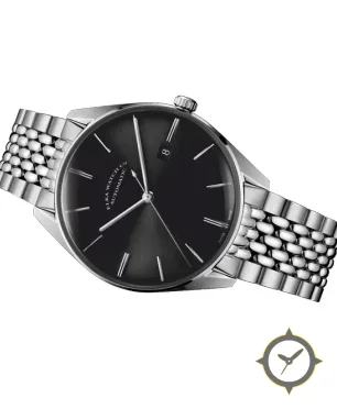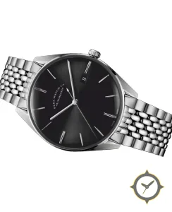 Eine Dress-Uhr mit einem 35mm Gehäuse im Vintage-Stil gefertigt aus Edelstahl mit einem Zifferblatt in schwarz und einer besonderen "sunburst"-Oberfläche.