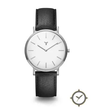 Eine Minimalistisch-Uhr mit einem vielseitigen 39mm Gehäuse, das an fast jedes Handgelenk passt, gefertigt aus Edelstahl mit einem Zifferblatt in weiß und einer besonderen "smooth"-Oberfläche.