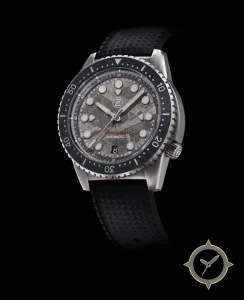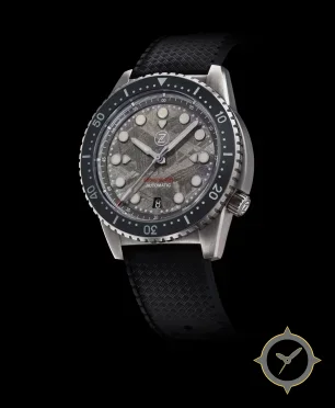 Eine Taucheruhr-Uhr mit einem vielseitigen 40.5mm Gehäuse, das an fast jedes Handgelenk passt, gefertigt aus Edelstahl mit einem Zifferblatt in grau und einer besonderen "meteorite"-Oberfläche.