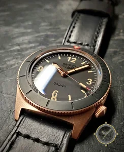 Eine Taucheruhr-Uhr mit einem markanten 49mm Auftritt am Handgelenk, gefertigt aus Bronze mit einem Zifferblatt in schwarz und einer besonderen "matte"-Oberfläche.
