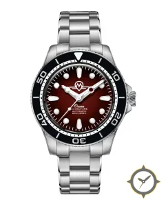 Eine Taucheruhr-Uhr mit einem markanten 43.5mm Auftritt am Handgelenk, gefertigt aus Edelstahl mit einem Zifferblatt in rot und einer besonderen "sunburst"-Oberfläche.