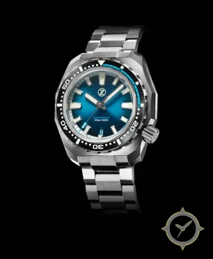 Eine Taucheruhr-Uhr mit einem markanten 49.5mm Auftritt am Handgelenk, gefertigt aus Edelstahl mit einem Zifferblatt in blau und einer besonderen "sunburst"-Oberfläche.