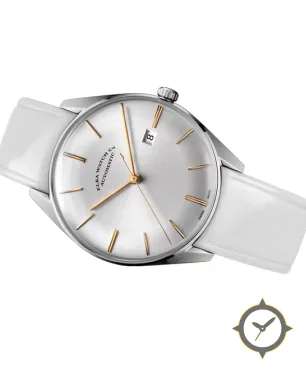 Eine Dress-Uhr mit einem 34mm Gehäuse im Vintage-Stil gefertigt aus Edelstahl mit einem Zifferblatt in silber und einer besonderen "sunburst"-Oberfläche.