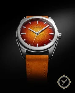 Eine Dress-Uhr mit einem markanten 44mm Auftritt am Handgelenk, gefertigt aus Edelstahl mit einem Zifferblatt in orange und einer besonderen "granulated sunburst with metallic/fumé gradient (yellow center to red-orange edges)"-Oberfläche.