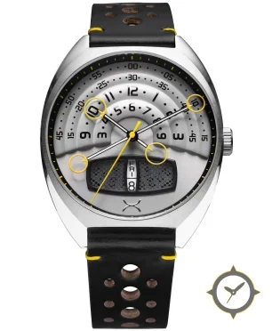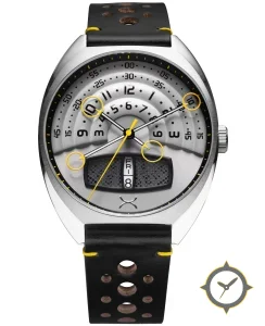 Eine Racing-Uhr mit einem markanten 41.5mm Auftritt am Handgelenk, gefertigt aus Edelstahl mit einem Zifferblatt in silber und einer besonderen "brushed concentric ridges"-Oberfläche.