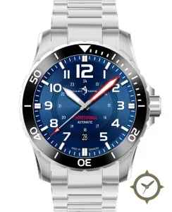 Eine Taucheruhr-Uhr mit einem 36mm Gehäuse im Vintage-Stil gefertigt aus Edelstahl mit einem Zifferblatt in blau und einer besonderen "sunburst"-Oberfläche.