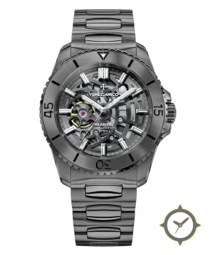 Eine Skelett-Uhr mit einem 37mm Gehäuse im Vintage-Stil gefertigt aus Edelstahl mit einem Zifferblatt in grau und einer besonderen "skeleton"-Oberfläche.