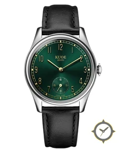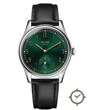Eine Dress-Uhr mit einem markanten 42mm Auftritt am Handgelenk, gefertigt aus Edelstahl mit einem Zifferblatt in grün und einer besonderen "metallic sunburst"-Oberfläche.