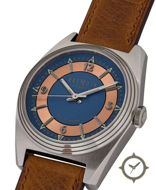 Eine Vintage-Uhr mit einem 33.5mm Gehäuse im Vintage-Stil gefertigt aus Edelstahl mit einem Zifferblatt in blau und einer besonderen "matte center with brushed outer ring"-Oberfläche.