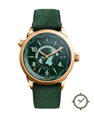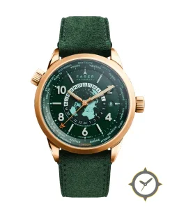 Eine Weltzeituhr-Uhr mit einem 36mm Gehäuse im Vintage-Stil gefertigt aus Gold mit einem Zifferblatt in grün und einer besonderen "guilloche/textured"-Oberfläche, ideal für Weltenbummler dank der Weltzeit-Funktion.