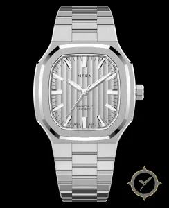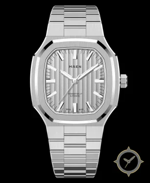 Eine Luxus-Uhr mit einem vielseitigen 39.5mm Gehäuse, das an fast jedes Handgelenk passt, gefertigt aus Edelstahl mit einem Zifferblatt in silber und einer besonderen "vertical guilloche / brushed"-Oberfläche.