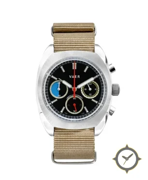Eine Chronograph-Uhr mit einem 34mm Gehäuse im Vintage-Stil gefertigt aus Edelstahl mit einem Zifferblatt in schwarz und einer besonderen "matte"-Oberfläche.