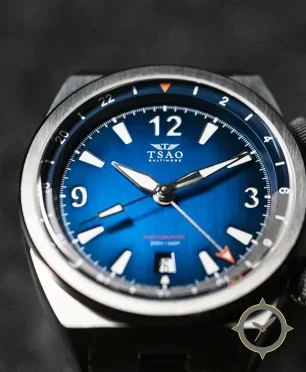 Eine GMT-Uhr mit einem markanten 44.5mm Auftritt am Handgelenk, gefertigt aus Edelstahl mit einem Zifferblatt in blau und einer besonderen "sunburst/gradient"-Oberfläche und einer echten GMT-Funktion, mit der du eine zweite Zeitzone verfolgen kannst.
