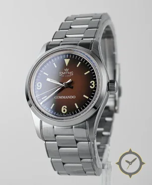 Eine Field-Uhr mit einem vielseitigen 38mm Gehäuse, das an fast jedes Handgelenk passt, gefertigt aus Edelstahl mit einem Zifferblatt in braun und einer besonderen "sunburst/gradient (fumé)"-Oberfläche.