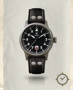 Eine Pilot-Uhr mit einem vielseitigen 38.5mm Gehäuse, das an fast jedes Handgelenk passt, gefertigt aus Edelstahl mit einem Zifferblatt in schwarz und einer besonderen "matte"-Oberfläche.