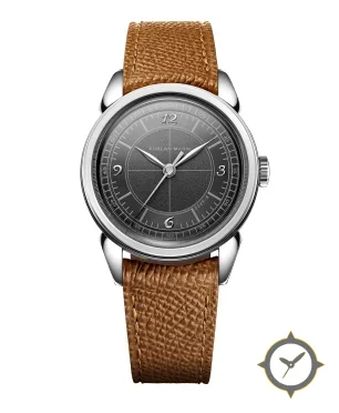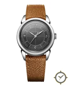 Eine Dress-Uhr mit einem markanten 42mm Auftritt am Handgelenk, gefertigt aus Edelstahl mit einem Zifferblatt in grau und einer besonderen "grained / matte center with slightly smoother outer ring"-Oberfläche.