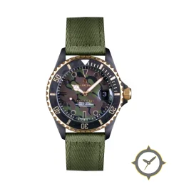 Eine Taucheruhr-Uhr mit einem 34.5mm Gehäuse im Vintage-Stil gefertigt aus Edelstahl mit einem Zifferblatt in grün und einer besonderen "matte (textile/camouflage)"-Oberfläche.