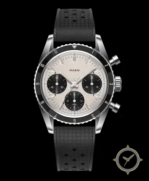 Eine Chronograph-Uhr mit einem vielseitigen 38.5mm Gehäuse, das an fast jedes Handgelenk passt, gefertigt aus Edelstahl mit einem Zifferblatt in weiß und einer besonderen "granular / sand-textured"-Oberfläche.