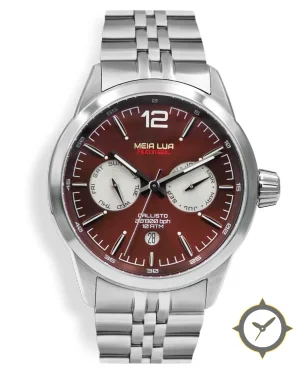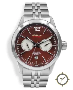 Eine Dress-Uhr mit einem vielseitigen 38mm Gehäuse, das an fast jedes Handgelenk passt, gefertigt aus Edelstahl mit einem Zifferblatt in braun und einer besonderen "sunburst"-Oberfläche.