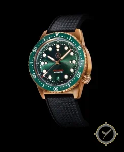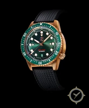 Eine Taucheruhr-Uhr mit einem 37.5mm Gehäuse im Vintage-Stil gefertigt aus Bronze mit einem Zifferblatt in grün und einer besonderen "sunburst guilloché (radial wave finish)"-Oberfläche.