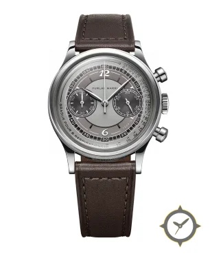 Eine Chronograph-Uhr mit einem vielseitigen 38mm Gehäuse, das an fast jedes Handgelenk passt, gefertigt aus Edelstahl mit einem Zifferblatt in grau und einer besonderen "two-tone matte (inner light gray, outer taupe/gray ring)"-Oberfläche.