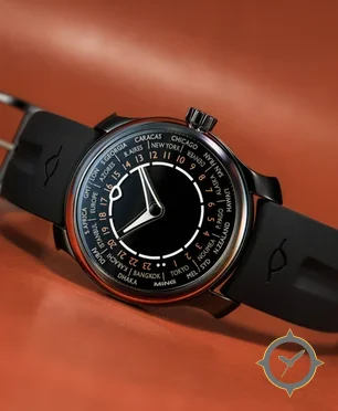 Eine Weltzeituhr-Uhr mit einem 35mm Gehäuse im Vintage-Stil gefertigt aus Edelstahl mit einem Zifferblatt in schwarz und einer besonderen "glossy"-Oberfläche, ideal für Weltenbummler dank der Weltzeit-Funktion.