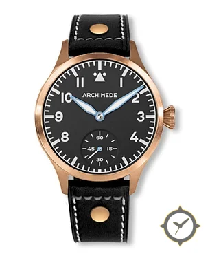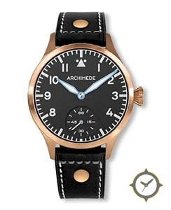 Eine Pilot-Uhr mit einem vielseitigen 39mm Gehäuse, das an fast jedes Handgelenk passt, gefertigt aus Bronze mit einem Zifferblatt in schwarz und einer besonderen "matte"-Oberfläche.