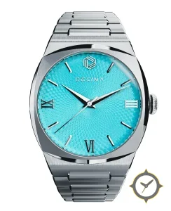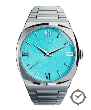 Eine Luxus-Uhr mit einem markanten 44mm Auftritt am Handgelenk, gefertigt aus Edelstahl mit einem Zifferblatt in türkis und einer besonderen "guilloché (engine-turned)"-Oberfläche.