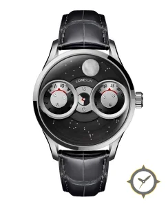 Eine Luxus-Uhr mit einem 34.5mm Gehäuse im Vintage-Stil gefertigt aus Edelstahl mit einem Zifferblatt in schwarz und einer besonderen "brushed (circular)"-Oberfläche.