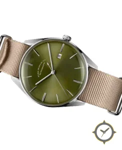 Eine Dress-Uhr mit einem markanten 49mm Auftritt am Handgelenk, gefertigt aus Edelstahl mit einem Zifferblatt in grün und einer besonderen "sunburst"-Oberfläche.