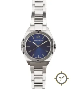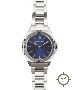 Eine Sport-Uhr mit einem markanten 46.5mm Auftritt am Handgelenk, gefertigt aus Edelstahl mit einem Zifferblatt in blau und einer besonderen "sunburst"-Oberfläche.