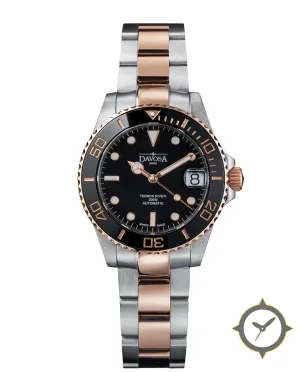 Eine Taucheruhr-Uhr mit einem 34mm Gehäuse im Vintage-Stil gefertigt aus Edelstahl mit einem Zifferblatt in schwarz und einer besonderen "glossy lacquer"-Oberfläche.