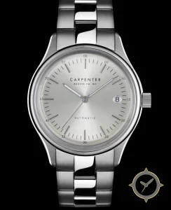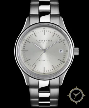 Eine Minimalistisch-Uhr mit einem markanten 45mm Auftritt am Handgelenk, gefertigt aus Edelstahl mit einem Zifferblatt in silber und einer besonderen "sunburst"-Oberfläche.