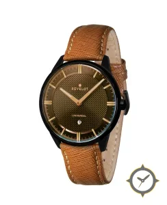 Eine Dress-Uhr mit einem vielseitigen 40.5mm Gehäuse, das an fast jedes Handgelenk passt, gefertigt aus Beschichtung mit einem Zifferblatt in braun und einer besonderen "textured"-Oberfläche.