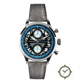 Eine Chronograph-Uhr mit einem vielseitigen 40mm Gehäuse, das an fast jedes Handgelenk passt, gefertigt aus Edelstahl mit einem Zifferblatt in schwarz und einer besonderen "skeletonized open-work"-Oberfläche.