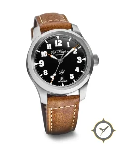 Eine Pilot-Uhr mit einem vielseitigen 38.5mm Gehäuse, das an fast jedes Handgelenk passt, gefertigt aus Edelstahl mit einem Zifferblatt in schwarz und einer besonderen "glossy"-Oberfläche.