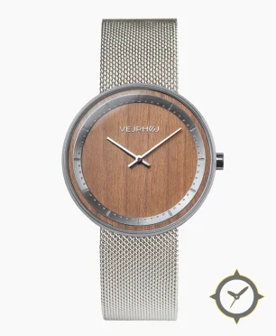 Eine Minimalistisch-Uhr mit einem vielseitigen 38mm Gehäuse, das an fast jedes Handgelenk passt, gefertigt aus Edelstahl mit einem Zifferblatt in braun und einer besonderen "wood"-Oberfläche.