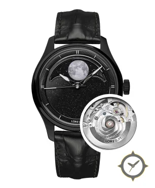 Eine Dress-Uhr mit einem 34.5mm Gehäuse im Vintage-Stil gefertigt aus Edelstahl mit einem Zifferblatt in schwarz und einer besonderen "aventurine (sparkling / starfield)"-Oberfläche und einer wunderschönen Mondphasenanzeige.