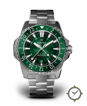 Eine GMT-Uhr mit einem 33.5mm Gehäuse im Vintage-Stil gefertigt aus Edelstahl mit einem Zifferblatt in grün und einer besonderen "sunburst"-Oberfläche und einer echten GMT-Funktion, mit der du eine zweite Zeitzone verfolgen kannst.