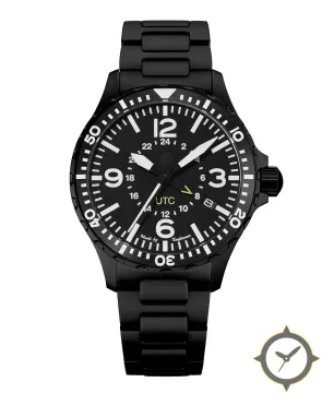 Eine GMT-Uhr mit einem 32mm Gehäuse im Vintage-Stil gefertigt aus Edelstahl mit einem Zifferblatt in schwarz und einer besonderen "matte"-Oberfläche und einer echten GMT-Funktion, mit der du eine zweite Zeitzone verfolgen kannst.