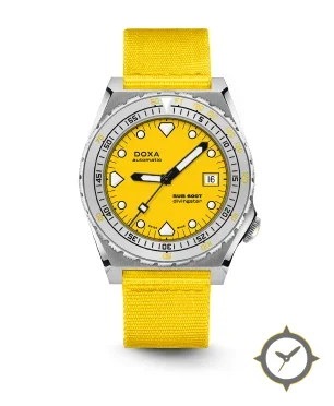 Eine Taucheruhr-Uhr mit einem markanten 41.5mm Auftritt am Handgelenk, gefertigt aus Edelstahl mit einem Zifferblatt in gelb und einer besonderen "matte"-Oberfläche.