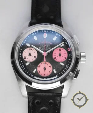 Eine Chronograph-Uhr mit einem 36mm Gehäuse im Vintage-Stil gefertigt aus Edelstahl mit einem Zifferblatt in schwarz und einer besonderen "grained center with sunburst gradient towards the top (blue fade)"-Oberfläche.