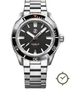 Eine Taucheruhr-Uhr mit einem 36mm Gehäuse im Vintage-Stil gefertigt aus Edelstahl mit einem Zifferblatt in schwarz und einer besonderen "granular/textured"-Oberfläche.