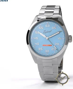 Eine Pilot-Uhr mit einem markanten 43mm Auftritt am Handgelenk, gefertigt aus Edelstahl mit einem Zifferblatt in blau und einer besonderen "matte"-Oberfläche.