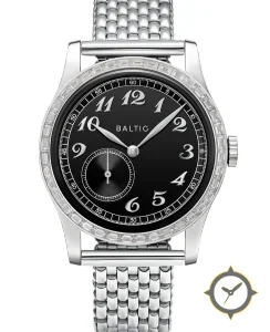 Eine Dress-Uhr mit einem vielseitigen 39.5mm Gehäuse, das an fast jedes Handgelenk passt, gefertigt aus Edelstahl mit einem Zifferblatt in schwarz und einer besonderen "smooth glossy"-Oberfläche.