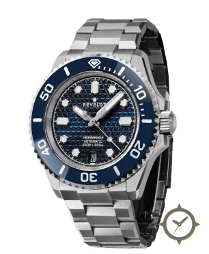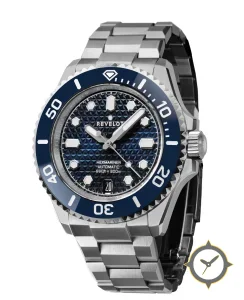 Eine Taucheruhr-Uhr mit einem markanten 47mm Auftritt am Handgelenk, gefertigt aus Edelstahl mit einem Zifferblatt in blau und einer besonderen "textured geometric (pyramid) guilloché-style"-Oberfläche.