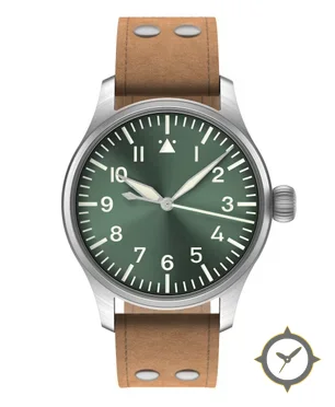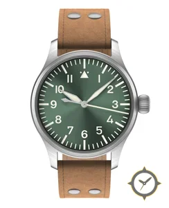 Eine Pilot-Uhr mit einem vielseitigen 38mm Gehäuse, das an fast jedes Handgelenk passt, gefertigt aus Edelstahl mit einem Zifferblatt in grün und einer besonderen "sunburst"-Oberfläche.