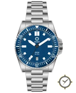 Eine Taucheruhr-Uhr mit einem 31mm Gehäuse im Vintage-Stil gefertigt aus Edelstahl mit einem Zifferblatt in blau und einer besonderen "grained"-Oberfläche.