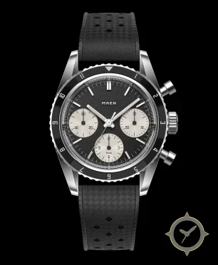 Eine Chronograph-Uhr mit einem markanten 43mm Auftritt am Handgelenk, gefertigt aus Edelstahl mit einem Zifferblatt in schwarz und einer besonderen "grained"-Oberfläche.