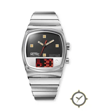 Eine Vintage-Uhr mit einem 35.5mm Gehäuse im Vintage-Stil gefertigt aus Edelstahl mit einem Zifferblatt in schwarz und einer besonderen "matte"-Oberfläche.